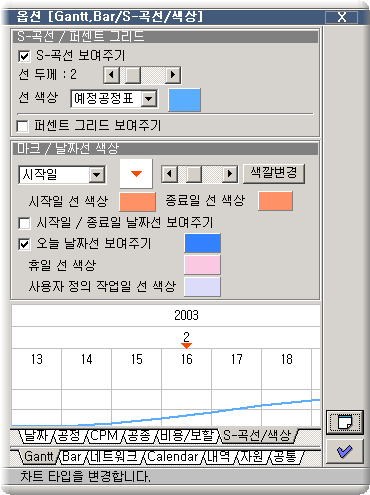 ¼± »ö»ó : S-°î¼±ÀÇ ¼± »ö»óÀ» ¼³Á¤ÇÕ´Ï´Ù. ¸ÕÀú µµÇ¥ ŸÀÔÀ» ¼±ÅÃÇÕ´Ï´Ù. µµÇ¥ ŸÀÔÀº ¿¹Á¤°øÁ¤Ç¥¿Í ½Ç½Ã°øÁ¤Ç¥ µÎ °¡ÁöÀÔ´Ï´Ù. ±× ´ÙÀ½¿¡ »ö±òº¯°æ ¹öưÀ» Ŭ¸¯ÇÑ µÚ »ö»óÀ» ¼³Á¤ÇÕ´Ï´Ù. |